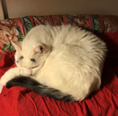 Fuchur schleicht sich, wenn ich liege an und legt sich mondförmig über meinen Kopf. Des Nachts rückt er immer näher ran. Des Morgens bleibt mir circa ein Viertel des Pölsterchens. Jetzt liegt er im Brotkörbchen. Ist ja noch nicht Schlafenszeit. Und morgens werde ich manchmal durch sanftes Streicheln von feinen Schnurrbarthärchen gewckt.
