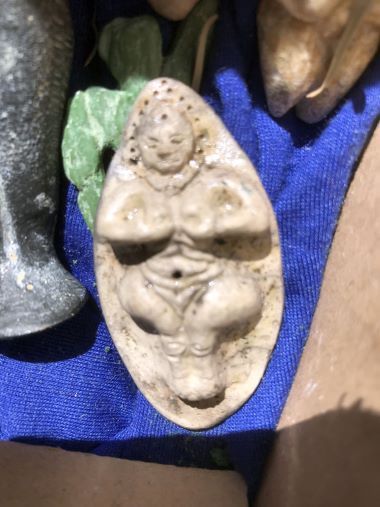 Ich wähle für die 4. Heiltrance im Zyklus die Haltung der Statuette aus, die mir Inge D. geliehen hat. Sie ist aus Metall, vielleicht aus Bronze, hat einen gewölbten Bauch und hervorstehenden Nabel. Sie wirkt schwanger. Die großen Ohren sind bei indonesischen Figuren zu finden. Die Beinhaltung findet sich bei der Baubo.