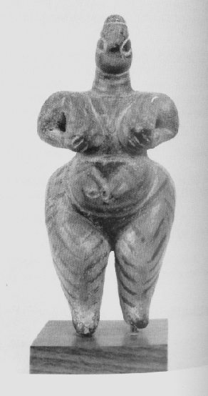 Einen meiner Lieblingshaltungen. Die Statuette mit dem Schlangenaugen und den roten Zeichen am Körper steht aufrecht da. In Wiesbaden im Frauenmuseum, bei der Ausstellung für Marija Gimbutas "Sprache der Göttin" hatte ich sie zum ersten Mal gesehen.