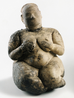 Die Wahrsagehaltung aus Chatal Hüyük in Anatolien, vor 85000 Jahren aus Ton gefertigt ist 15,5 cm groß. Auch hier ist der Nabel ausgeprägt, was Schwangerschaft und Gebären anzeigt.