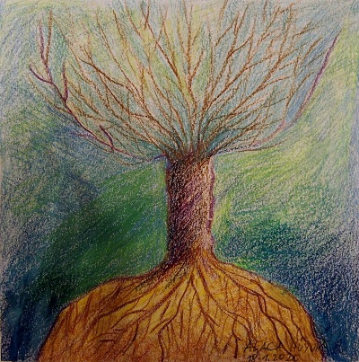 Ich bin ein Baum, aufgerichtet. Viele Wurzeln. Am Ende erlebe ich die Haltung als mich zusammenfassend. Fühle mich komprimiert, gefestigt im Herzen und in der Brust.