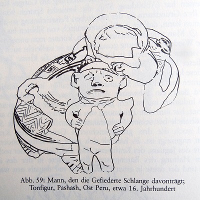 Ich habe soeben eine Zeichnung von einem peruanischen Gefäss gesehen, bei der die Gefiederte Schlange, die Totengöttin, einen, Mensch am Kopf hält und mit sich mitnimmt. Sie bilden einen Kreis in diesem Flug.