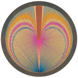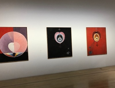 Die feinen Striche vonGeorgiana Houghten und die Farben in Rose, Lila, Blau, Orange sind schon am Plakat zu sehen. Laut Katalog ist sie als Letzte von der Kunstwelt wiederentdeckt worden. Gelebt hat sie von 1814-1884 im viktorianischen England. Ebenso wie die Schwedin Hilma af Klint (1862-1944) war sie mit der Theosophischen Gesellschaft verbunden. Alle drei Künstlerinnen hatten einen Draht zu der anderen Wirklichkeit. Hilma af Klint schuf beispielsweise einen Zyklus von 193 Bildern. „Malereien für den Tempel“. Sie beschreibt: „Die Bilder wurden durch mich hindurchgemalt, ohne Vorzeichnungen und mit großer Wucht.“ Zehn dieser Bilder, 1907 ausgeführt, haben ein Ausmaß von 3,28 mal 2,40m. Sie werden derzeit im Guggenheim Museum New York gezeigt. Mir sind diese Bilder zuerst am Fremdesten. Abstrakte Formen in oft hellen Farben. Fast an Pop Art mich erinnernd. (Bild 2) Doch ich habe den Katalog und auch im Web kann ich durch Ausstellungen spazieren und mich mit ihnen vertraut machen.