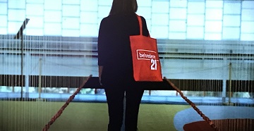 Textile Kunst von Polly Apfelbaum (1955) im 21er Haus; nahe des Hauptbahnhofes. In Socken müssen die Besucherinnen über die farbprächtigen, grossformatigen Teppiche gehen."Make sure to wear nice socks". 2 Fotos aus der aktuellen Ausstellung.