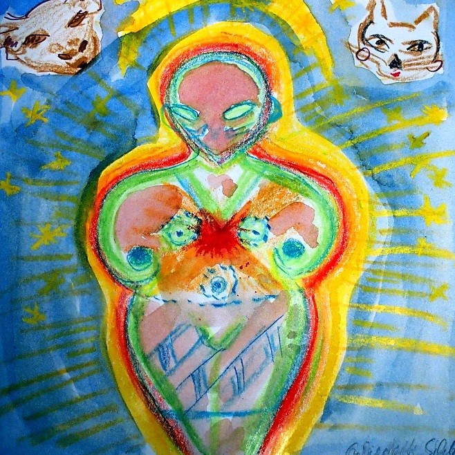 Felicitas D.Goodman beschreibt in „Trance“ (1989), den Mythos, in dem sich die Krea-tur in eine Höhle zurückgezogen hatte und deren Seelensubstanz vom Schamanen hervorgeholt wird um der Erde bei der Fortpflanzung und Vermehrung behilflich zu sein. Der Kreislauf des Lebens, Sterbens, der Darstellung der Substanz des Wesens und die Wiederauferstehung ist Thema. Viel Energie wird in der Trance spürbar und die Gefiederte Schlange, die Schlange mit den Federn oder die Drachin, zeigt sich manchmal dabei. In den Graphiken zeigt sich diese vertikale Achse des Weltenbaumes, ebenso die Polaritäten von rund und eckig, (Beispiel: mäanderndes Labyrinth), mit energieumfluteten Frauengestalten und mit Fruchtbarkeit anregenden Pflanzengeistern.