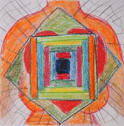 Beim Papierformat blieb ich beim Quadrat und benutzte weiter Ölkreiden, aber auch Buntstifte, Bleistifte und Aquarellfarben. Das Bild bekam, ebenso wie der Trancetext, einen Titel, um die Energie der Trance zu sammeln und auf einen Punkt zu bringen. Später war das bei der Auswertung der Trancen sehr hilfreich.