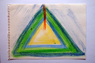 Die ersten Kritzeleien mit farbiger Ölkreide auf Zeichenpapier scheinen roh, ungeordnet, spontan, keinen Anspruch gehorchend, etwas „Schönes“ ausdrücken zu wollen. Das ist es auch was ich den Mitreisenden vermitteln will. Die meisten Menschen sind gerade was d as Zeichnen und das Singen betrifft, zu tiefst verletzt und damit in ihren Ausdrucksmöglichkeiten gebremst, wenn nicht sogar vollkommen blockiert worden. Ich erinnere mich an die Aussage einer Frau, als ich ihr vorschlug nach der Trance, etwas auf Papier zu bringen. Sie sagte einen Satz, der mir im Herzen weh tat.“ Schade ums Papier“. So viele Abwertung lag darin, so viele Unterdrückung und Gewalt an der Seele. Kay Hoffman, als Tänzerin und sich zwischen den Welten Bewegende, empfiehlt vor dem Zeichnen zuerst den Körper zu spüren und zu atmen.