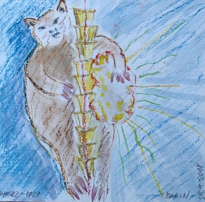Zu Walpurgis ein Ritual. Ich habe Rückenschmerzen. Ona rasselt für mich. Wir konzentrieren uns in der Bärinnenhaltung auf meine Linderung. Am nächsten Tag kommt die Zeichnung der Bärin, wie sie ein Gebilde hält. Es ist nicht klar, was sie damit tun wird. Wird sie es streicheln, fressen oder zerreißen.