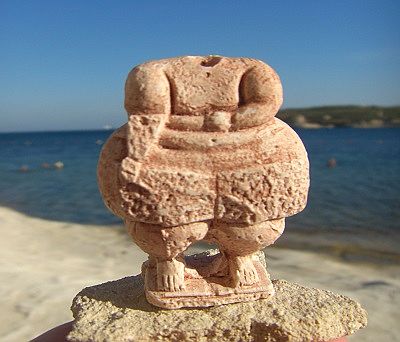 Foto links: Hagar Qin aus Ton, 13 cm groß. Bei der ersten Ausgrabung 1839 entdeckt. Datiert 3000 B.C., Archäologisches National Museum Valetta (Filmlink),  Link zu einem E-Kathalog über das megalithische Malta