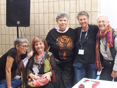 Foto 2: Susan Hawthorn und Renate Klein von Spinnifex, Susanne Bischoff -Graugänse und Gabriele Freytag, die ich da letzte Mal vor 2o Jahren am Feministischen Therapiekongress traf. Foto 3: Gedenkkugel ca. 50 cm Durchmesser, Foto 1: die Moderatorinnen der ELC.