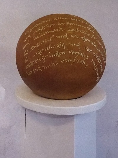 Die Eigenschaften Zähigkeit und Eigensinn sind auch bei der Gedenkkugel, die an die Lesben, die durch den NS Verfolgung gelitten haben und ermordet wurden, zum Tragen gekommen. Die Geschichte ist, dass diese Gedenkkugel in der Gedenkstätte Ravensbrück aufgestellt wurde und mit dem Argument, dass die Verfolgung nicht nachgewiesen ist, wieder an einen anderen Platz, dem Schwulenmuseum, gebracht wurde. Das internationale Komitee der Lagergemeinschaft der Frauen von Ravensbrück bleibt zähe daran, ihren Protest zu äußern und an der Sichtbarmachung der Verfolgung weiter zu arbeiten.