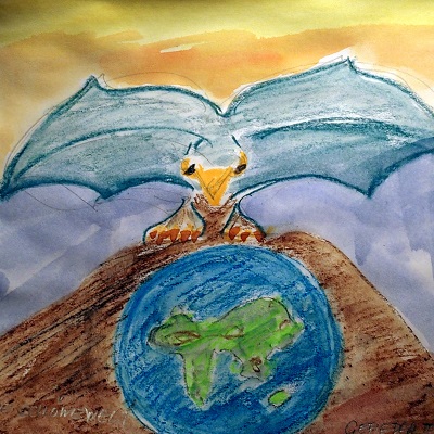 Die Adlerin, die beim Atmen aufgetaucht ist fliegt, segelt mit weiten Schwingen hoch über das Dorf. Umrundet es. Ein Lichtspiel. Helle Licht-Sonnenstrahlen fallen gebündelt von links oben ins Dorf herein.
