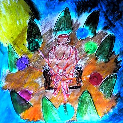 Die Patinnen, mindestens 7 sind da, umrunden beide. Sie legen eine Hand über die Hand der Anderen. Dabei segnen sie das Kind und bringen ihre Gaben. Freude, Schutz, Lachen, Liebe, Freiheit, Unbändigkeit, Licht. Die Gaben vermachen sie dem Kind, es ist ein Vermächtnis.