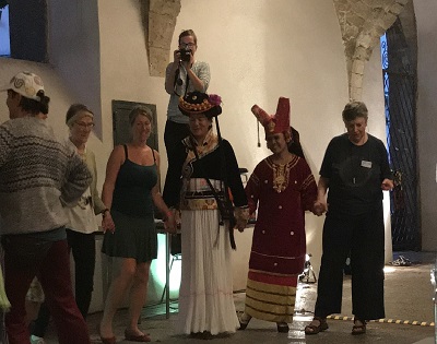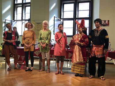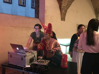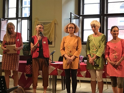 Unter den schönen Arkaden des alten Rathauses aus dem 14. Jahrhundert stellten Handwerkerinnen und Künstlerinnen ihre Produkte aus und informierten über ihre Fertigkeiten und Philosophien. Das Felicitas Goodman war auch dabei. An unserem Tisch fanden schöne Gespräche mit den Besucherinnen des Kongresses über Erfahrungen mit den Trancehaltungen, Erzählungen über Heilwirkungen der Rituellen Körperhaltungen, über Begegnung mit Felicitas Goodman und dem Vermissen ihr begegnet zu sein, statt. Ein kleines Angebot unserer Filme und Bücher, wie: “Tore zur Lebendigkeit – Trancehaltungen der Welt“ fanden interessierte Käuferinnen. Auch sonst, in den Pausen und nach den Veranstaltungen, gab es interessante Gespräche und Begegnungen. Wunderbar wie die MatriaValfrauen, die Verbindung und Gespräche der Menschen mit unterschiedlichen Sprachen so moderierten, dass sie sich und auch wir sie verstanden. Englisch, Chinesisch, Mosuo, Deutsch, Khasi-indonesisch wurde angewendet. Im Abschlussplenum berührte die gegenseitige Dankbarkeit von Einzelnen und Gruppen von Besuche*innen mit den Mutterlandgäst*innen.