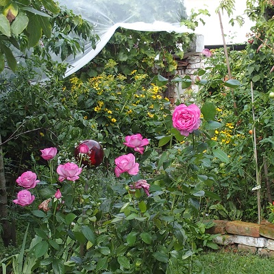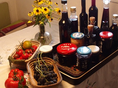 Das Verkochen des Hollers ist wie jeden Herbst eine rituelle Aktion. Abrebeln, wiegen, mit etwas Wasser, Zimt und Nelken kochen, auspressen und nochmals den Saft mit Zucker aufkochen. Mit einem Teil des Saftes mache Likör indem ich einfach Wodka dazugebe. Auch Hollerkompott zusammen mit gesammelten Zwetschken. Die meisten supersaftigen Weinbergpfirsiche habe ich verschenkt und gegessen und vom kleinen Rest mache ich auch Kompott. Uns so üppig blühend waren diese Blue- irgendwas noch nie.