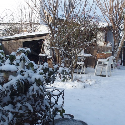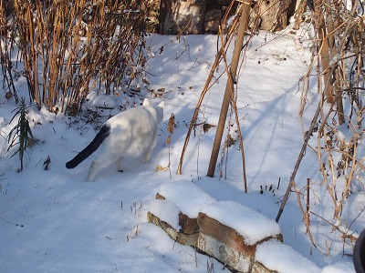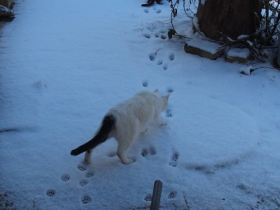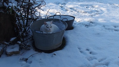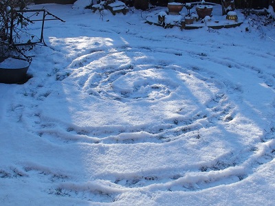 Und dann war es SO! Schaue wieder beim Fenster hinaus, es strahlt weiß. Die Katzen wollen auch hinaus. Die kleine Kore hoppelt wie ein Hase und Fuchur als getarnte Schneekatze hinter ihr her. Es tut so gut. Sonne, blauer Himmel und da Schee im Garte liegt, bekomme ich wieder eine Spirale.