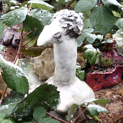 Es gäbe so viel zu schreiben. Vielleicht morgen. Trotz der GästInnen. Denken tue ich jedenfalls. Foto: Die thessalische, vogelköpfige Göttin aus Seslo - Megali Vrisi 5700 v.d.Z., von einer weinviertler Künstlerin nachempfunden, zwischen meinen Brombeeren.