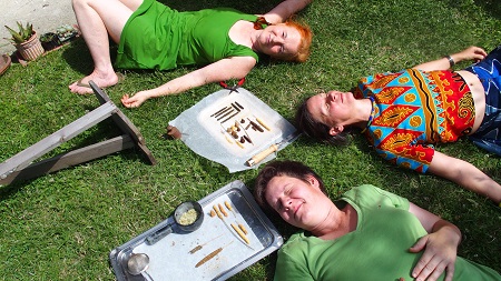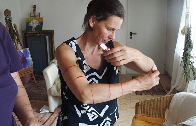 Wir feierten gemeinsam Lammas im Weinviertel. Ich schlage die Körperhaltung der Schamanin von Tell Halaf wieder vor. Wir hatten uns rot bemalt, laut des Vorschlags in „Ekstatische Trance - das Praxisbuch“.