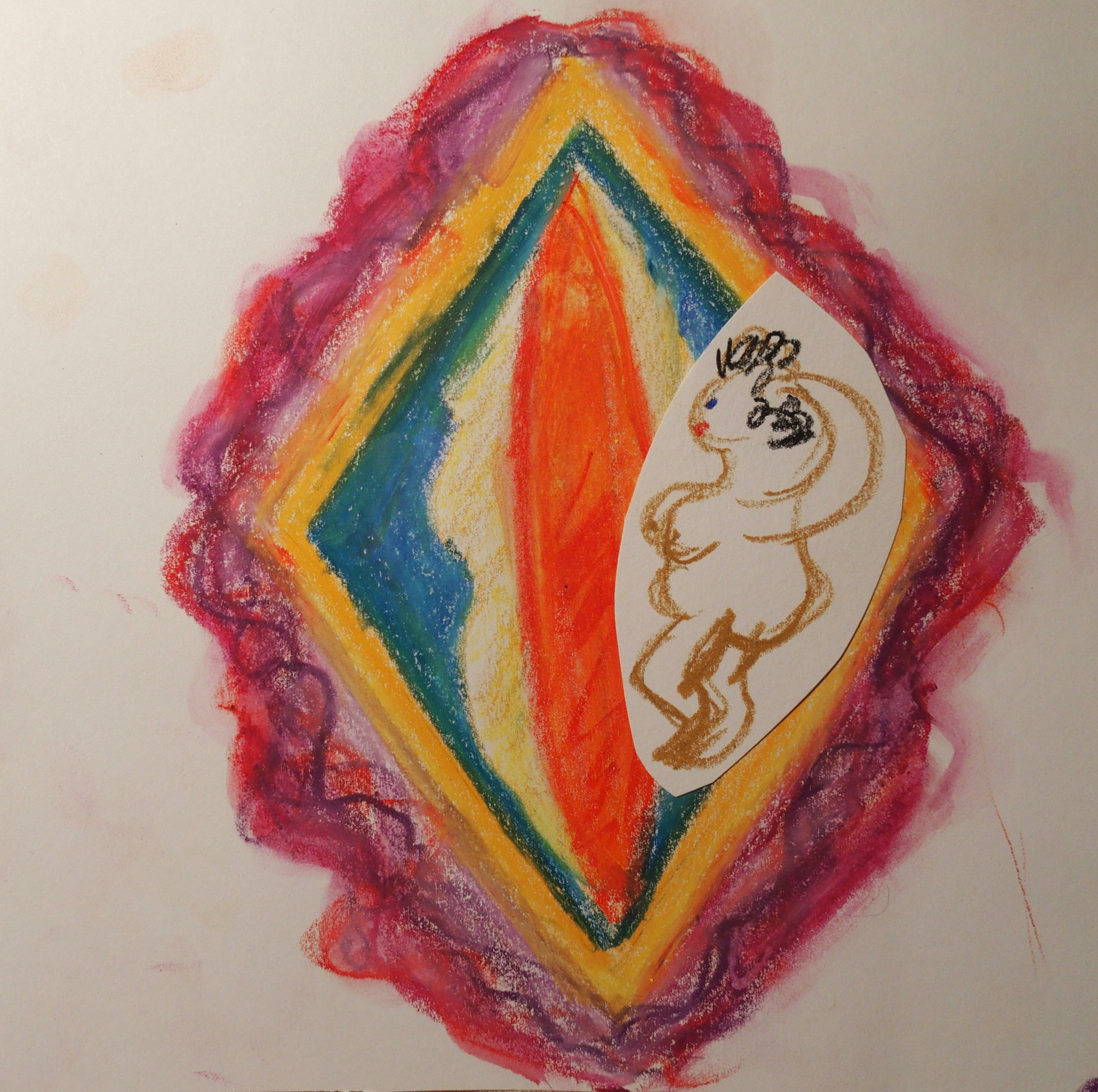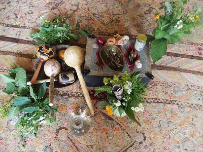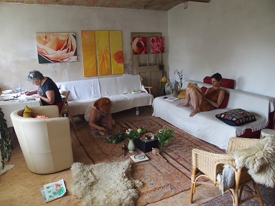 Die Freundinnen kommen zur Sommersonnwende. Wir holen uns aus dem Garten die Kräuter für die Sträuße. Schafgarbe, Frauenmantel, Ziest, Brennnessel, Wegerich, Beifuß, Wermut, Holunder und was so Jede will. Es ist eine unüberschaubare Vielfalt an Pflanzen hier. Im Ritual gehen wir in die Haltung der Schamanin aus Cholula. Der mit dem spitzen Hut und dem Kragen und der Zunge zwischen den Lippen. Beim Aufstellen ergibt sich die Geometrie der Raute, die wiederum die Vulva darstellt. Danach sind wir erfrischt und gelöst, ruhig und heiter. Ich hatte eine Liebstöckelsuppe vorbereitet und Salat. Es schmeckt - natürlich. Zur Erfrischung fahren wir zum Bach beim Lindenhof.