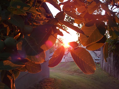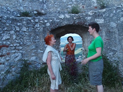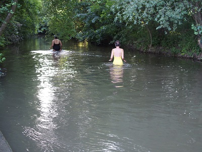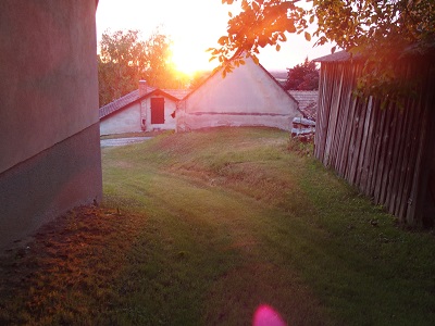 Er ist seicht aber mit einer leichten Strömung Richtung Laa. Der Boden ist mit feinem Sand bedeckt, so dass es angenehm ist gegen die Strömung,den Bach "aufwärts" zu gehen. Die Büsche machen fast ein Dach und die tiefstehende Sonne glitzert über dem Wasser. Dann lassen wir uns zurücktreiben. Es macht totalen Spaß, wir Posen wie Ester Williams und zerkugeln uns. Dann noch zu den Kirschenbäumen in den Farben der Göttin. Karin muss auf den Baum und holt welche von ziemlich hoch oben. Dann geht’s noch auf den Berg und tatsächlich finden wir einiges an Johanniskraut für einen Ansatz. Ein wenig Wind kommt auf und es tut gut in die Weite zu blicken. Auch am nächsten Tag haben wir noch viel Spaß und tanzen tatsächlich und endlich Rumba im Garten.