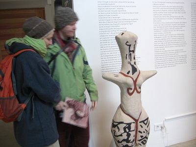 Die Ruhe und Weite der Hügel um den Schanzberg bei Falkenstein und der Besuch der Ahnin an ihrem Platz im Falkensteiner Wald. Ein Kreis von mächtigen Eichen umrahmt den Fundplatz der Frauenstatuette von Falkenstein. Wir können noch Teile der alten Kreisgrabenanlage im Boden erkennen und uns in dieser Stille auf die Geschehnisse vor tausenden von Jahren orientieren. Der Kopf der Ahnin auf einer Stele ragt über uns hoch. Im März hatte ich mit den Freundinnen die Gelegenheit der Museums Eröffnung und kostenfreien Eintritt genutzt und wieder mal vorbeigeschaut, ob sich die Museumsmacher zu einer Veränderung der Verschandelung der Statuette der Frau von Hluboke Masuvky aus Südmähren durchringen konnten. War nicht der Fall. Sie darf noch immer den Bildschirm tragen. Ein Foto erspare ich mir.