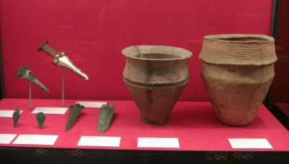 Die Keramik Ware aus Wiltshire, Gefäße, Töpfe aus der Glockenbecher Kultur und oben aus dem Weinviertel das Beispiel der Lengyel Keramik.