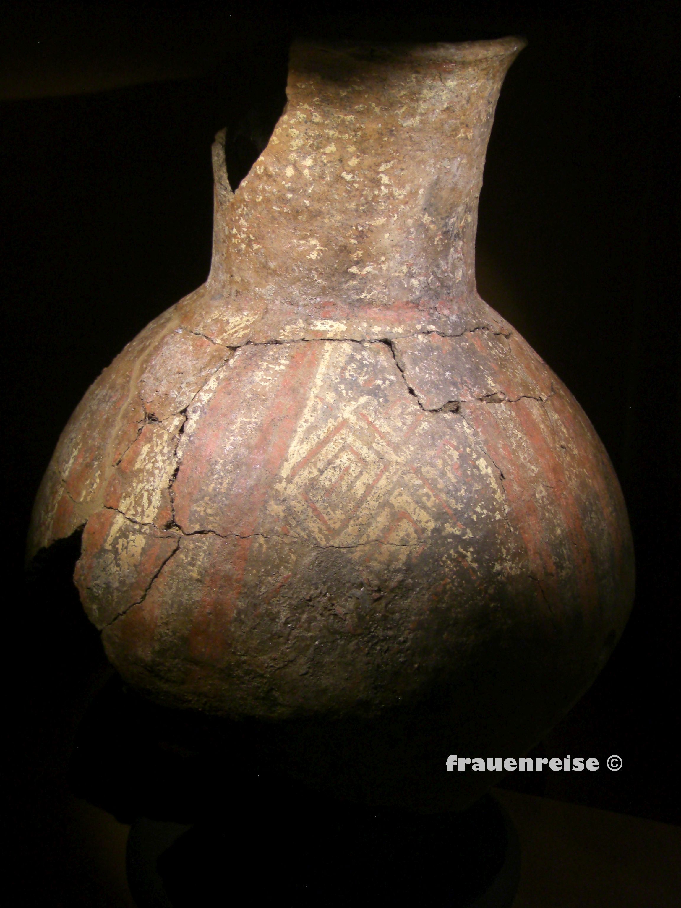 Viel Puplizität über den Bodenradar mit dem auch in der Umgebung bei Stonehenge die Erde untersucht wurde un deiniges zu Tage trat. Wolfang Neugebauer vom Ludwig Bolzmann Institut in Wien hat diese Technik entwickelt und damit  konnten neue Henges und Gruben mit Objekten entdeckt werden. Im Ausstellungsfilm ist das zu sehen. Auch diese Ausstellung ist im Bezug auf die Rollen von Frauen und Männern zurückhaltend gestaltet. Wer hat was zu welchem Zweck gemacht, das bleibt offen. Ich finde es schwer mich berühren zu lassen und lebendiges Interesse aufkommen zu lassen. Ist alles irgendwie interessant und dann doch distanziert und neutral. Immer wieder ein Ärgernis diese Ausstellungen, die die weibliche Geschichte und Vergangenheit ignorieren. Dann wird es doch langweilig. Erst bei den Keramikgefäßen werde ich warm. Besonders die Gefäße aus Zwingendorf und Poysbrunn erfreuen mich in ihrer exzellenten Handwerkskunst und den Mäandermustern in Rot und Gelb. GHöhepunkt der Ausstellung ist der Gruss der Göttin durch die goldene Raute. Dass die Raute den Schoss, die Vulva der Göttin repräsentiert, ist bei Marija Gimbutas so erfräulich (Zitat von Monica) nachzulesen.