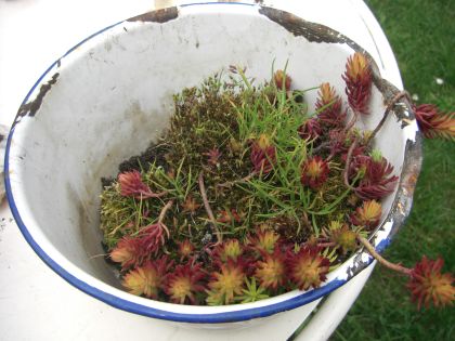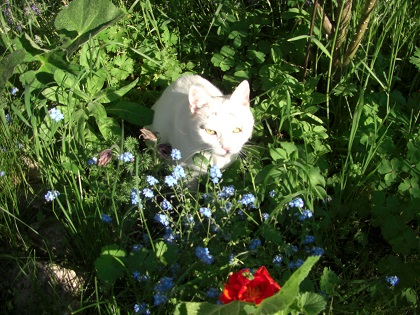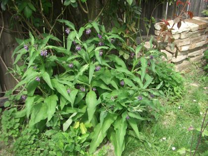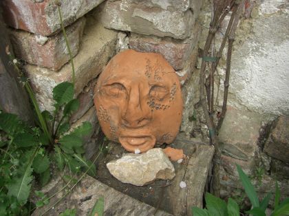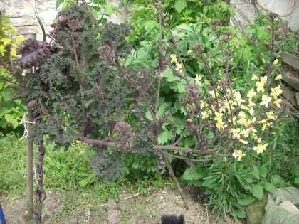 Es, ich gartle. Trotz grauen Himmel. Dafür wächst alles weiter wie um die Wette. Wenn ich den Blick nur in einem kleine Bereich schweifen lasse, bin ich immer wieder so fasziniert  was da alles an Vielfalt aus der Erde drängt. Da ist einmal die Stockrose, die zwischen Betonterasse und Wiese hervorsprießt und jetzt schon einen halben Meter hoch und breit ist. Dann die Gänseblümchen und Hornveilchen, vorzugsweise zwischen den Ziegeln der Terasse. Margariten kommen, Wegerich, Schafgarbe, Wegwarte-noch klein aber nicht mehr lange. Hirtentäschel, Mutterkraut überall, Wermut, Himbeeren weit und breit, auch im zukünftigen Gemüsebeet und da muss es raus. Ankündigung von Baumspinat, wissend, dass er über einen Meter hoch wird. Und der Liebstöckel den ich bisher etwas ignoriert hatte und heute davon eine Suppe kochen will. Foto 1 Beinwell (unzubändigen), Foto 3 UNUH die Ahnin; und über das Vulvenbrot habe ich mich besonders gefreut und auch über den ausgewachsenen, zitronengelb blühenden Rotkohl vom letzten Jahr.