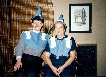 Felicitas Goodman und Belinda Gore mit Hut und Kragen der Dame von Chollula, ca. 1992