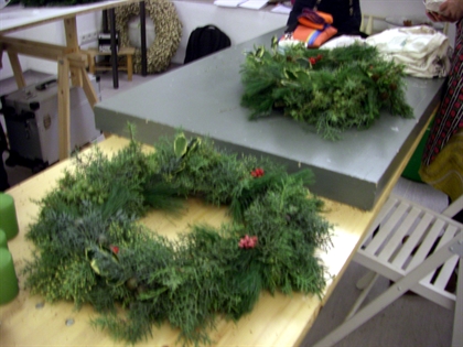 Kranz mein erster Grüner, mit Zerdern und Kiefern. Nicht schlecht! Solveig vom Asthaus hat mir dabei geholfen, ich gebe es zu.