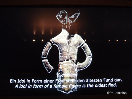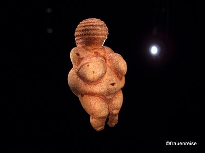 Das sogenannte Venuskabinett ist ein Raum, in dem die Statuette der Willendorferin in einem Glaskasten rundum anzuschauen ist und durch die schwarze Aufstellung, vor schwarzem Hintergrund, zu schweben scheint. Die „Fanny“ nach der Tänzerin Fanny Elsler benannt, leider nicht. Und gerade bei ihr wäre es so wichtig, sie von allen Seiten zu sehen, damit bestimmte Bearbeitungsspuren, die die Zusammensetzung belegen, zu sehen sind. Das sagte mir die Ausgräberin der Fanny Dr. Christine Neugebauer-Maresch bei einem Rundgang durch die Schausäle. Beide Statuetten wurden nun durch Berücksichtigung der Schwankungen der 14C-Gehalt der Atmosphäre im Lauf der Geschichte um 4.500 Jahre zurück datiert. Nun wird die Willendorferin mit 29.500 Jahre und die Statuette aus Stratzing/Rehberg mit 36.000 Jahren datiert.