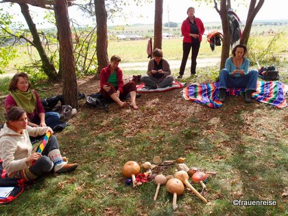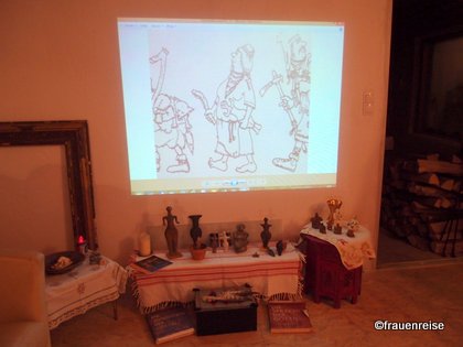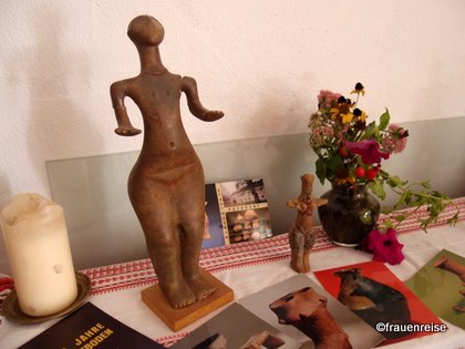 Es war ein sich im flexibel sein Üben. Museumsrenovierung und Kälte und Regen beim ersten Tagesausflug des Felicitas Goodman Institutes Österreich. So haben wir, die Veranstalterinnen, Susanne und ich, zuerst ein Museum in meinem Stall aufgebaut, mit jungsteinzeitlichen Göttinnen aus Tschechien, Anatolien und Malta und mit besonderen Repliken der Altsteinzeit aus Tschechien, Russland/Ukraine, Österreich. Doch im Unterschied zum Museum, bei uns konnte frau die Göttinnen in die Hand nehmen.