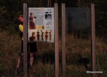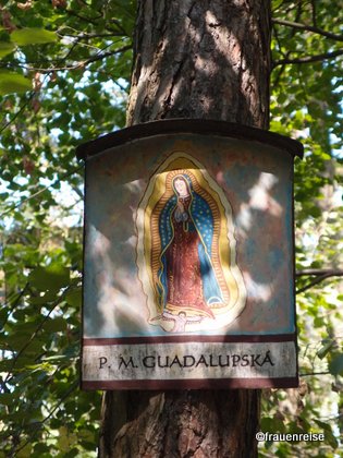 Es ist brütend heiß. Wir steigen vom Parkplatz vor der Kirche hoch zum kleinen Wald, von dem aus eine Sicht zum Fundplatz der weltberühmten Frauenstatuette ist. Diesmal sind wir mit weißem Papier ausgestattet um die durchsichtigen Schautafeln hinterlegen zu können und sie fotografieren zu können. Im Wäldchen schauen wir uns nach einem Platz für die Trance um. Kinder haben hier gespielt und sich kleine Baumnester gebaut mit Stöcken und Schnüren. Wir heben Müll auf und beginnen ohne Absprache den Platz zu richten. Wir werden immer ruhige und entspannter. Dann lassen wir uns nieder und horchen in den Wind. Das Rauschen der Blätter und die uralte Göttinnen Energie ist spürbar. Wir haben unseren Spaß beim Photographien der Tafeln, holen Wasser vom Bründl und stellen uns vor, wie das zu mehrt wird. Nach einer Stärkung gehen wir den Wahlfahrtsweg mit den vielen Madonnen hinauf.