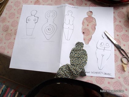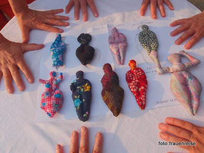 Einige Freundinnen meiner Freundinnen sind schwer krank. Bei meinen Göttinnen steht eine kleine Reisegöttin. Sie ist aus Seide, gut zu halten und duftet nach Lavendel. Ich habe sie mal zu meinem Geburtstag von Ulli bekommen. Ich denke, dass diese kleine Göttin für die kranken Freundinnen vielleicht schön wäre. Ich zeichne, entwickle einen Schnitt, wie es in der Schneiderei heißt und fertige eine Reisegöttin in der Bärinhaltung, weil sie die große Heilerin ist. Da ich keine Stoffreste hier habe frage ich meine Nachbarin Rosa. In ihrem Stoffkästchen gibt es jede Menge Reste von Schürzenstoffen in den unterschiedlichsten Musterungen, gestreift, kariert, gepunktet und natürlich geblümt. Ich suche mir einen Gänseblümchen Stoff aus. Später mit den Freundinnen mache ich eine Göttin in der Seelenführer Haltung. Sie hat die Arme nach oben gerichtet und das ist ein wenig kompliziert zu nähen und umzudrehen und zu füllen. Sabine macht es noch schwieriger. Sie passt die Figur ihrem Tranceerleben an. Wir arbeiten konzentriert und finden es gar nicht so einfach wie gedacht. Die Ergebnisse sind dann recht erfreulich.