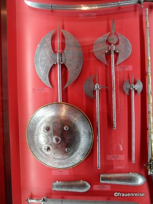 Es wird noch immer, oder wieder, renoviert. In einem Raum gibt es Waffen, besondere Schwerter (wäre etwas für Syna) und im anderen Raum Steine-Kristalle. Im Waffenraum entdecke ich einige Doppeläxte aus Persien. Das finde ich dann schon wieder etwas interessanter.