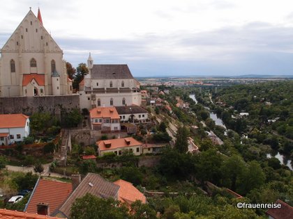 Znoymo liegt an einer Klippe über dem Dyje/Thayatal. Dort haben sich die Herrschenden eine Burg und einen Zitadelle erbaut. In den ehemaligen Stallungen wurden über 100 Jahre, bis 2009, Bier gebraut. Es ist ein interessanter Bau in schöner Lage. Irgendetwas soll hier geschehen. Eigentumswohnungen? Weit und breit keine Steinzeit Exponate. Später beim Recherchieren über Znoymo lese ich über die deutsch-tschechische Aufteilung Anfang des 20 Jhdt., über das angeregte Vereinsleben, der Zerstörung der Synagoge. Der Zeit nach 1945 und der Vertreibung der deutschsprachigen Bevölkerung wird in Wikipedia einiger Raum gegeben.