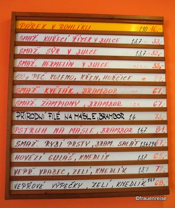 Irgendwie ist das Ganze anstrengend. Später denke ich, dass ich immer wieder zwischen den Zeiten bin - wechsle. Auf meiner Suche nach dem Neolithikum und im Gang durch die Stadt, gerate ich immer wieder in verschiedene Zeitzohnen. Am Platz gehe ich in ein Selbstbedienugslokal, in ein "Bufet", dass mich an das ehemalige Quisisana auf der Mariahilfer Straße erinnert. Da bin ich in den 50er Jahren angelangt. Wieder bin ich hier auf den guten Willen der Menschen angewiesen mich verstehen zu wollen. Bekomme dann einen Schweinsbraten, Kraut und Knödel auf meinen Teller. Immer wieder bin ich beim Umrechnen verwirrt. 72,- Kronen sind doch 1,8 Euro? Oder?