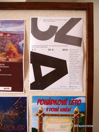 Gehe noch ins Haus der Kunst, das in einem schönen Renaissancehaus auf einem Renaissanceplatz liegt. Hier ist eine Ausstellung von tschechischen und österreichischen Künstlerinnen. Lizzy Mayerl ist eine von ihnen. Mir gefällt die Ausstellung ausnehmend gut. Lizzy Mayerl ist eine Stoffkünstlerin und ihre 3 Bilder haben mit Textilien und Bangladesch zu tun. Es wirkt auf mich, als würde sie die grausamen Arbeitsbedingungen dabei bedenken. Die Bilder sind aus T-Shirt Stoff gemacht in Schwarz, Rot und Pink. Durch die Begleitung der jungen Praktikantin durch die Ausstellung und ihrer Kontrolle kann ich nicht fotografieren.