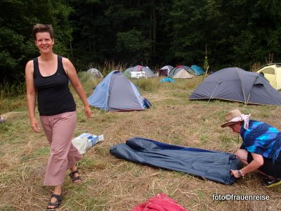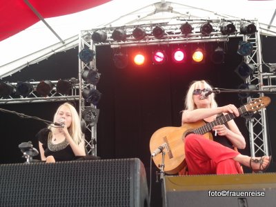Sonntags, nach einer anstrengenden Nacht, weil es so kalt war, nach dem Regen und Sturm, gibt es wieder blauen Himmel und ich frühstücke gemütlich und höre beim Proben zu. Ein paar schöne Pläusche mit den Frauen. Blind und Lame, Kika und Lucy Wilke, zwei Musikerinnen denen das Leben einiges auferlegte, wie der Name zeigt, spielen und singen ihrer Eigenkompositionen und Weltlieder und beschwingen uns. Dann schaue ich meine Sachen zusammen zu packen. Vom Musikzelt kommen noch Klänge von den sizilianischen Musikerinnen Trio Pi Prio, was » Drei für die Zufriedenheit der Seele » bedeutet. Die vielen Zeltsachen im Auto unter zu bringen ist nicht ganz einfach. Dann schaffen wir es doch und kommen nach 7 Stunden Fahrt Nächtens im Norden an.