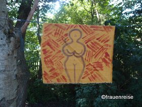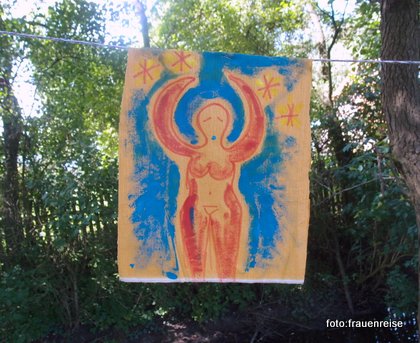 Trancereise in der Haltung der Frau von Hluboké Mašůvky in Südmähren. Ich nenne sie „Geballte Kraft“. Ich bekomme Schwingen, Vogel oder Fledermausschwingen. Anfangs lasse ich einen schrillen Schrei hochsteigen. Energie breitet sich aus um mich herum. Die Arme sind schwer beim Rasseln. Spüre mein Herz und den Kreis der Frauen und diesen Ort. Pferde sind da, mit wehender Mähne, wie die aus Peche Merle, die mit den Punkten. Befinde mich in einem Zustand der konzentrierten Intensität, der Dichte und des Ausbreitens. Das Gesicht eines Tiers mit Schnauze und hellem Fell ist vor mir. Später sehe ich die Zeichnung von der letzten Trance mit der Frau von Hluboké Mašůvky, mit dem Kopf eines Fuchses, einer Füchsin. Ist es die Selbe? Ich mag die Füchsin seit einem Tarotworkshop vor- nachdenken- ca. 30 Jahren als die Karte mit der Füchsin kam. Die Füchsin holt sich mit Strategie das was sie braucht, gewitzt, ohne Schuldgefühle.