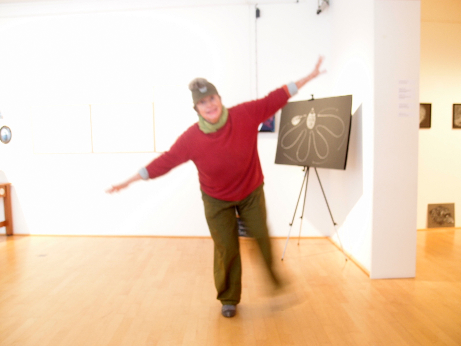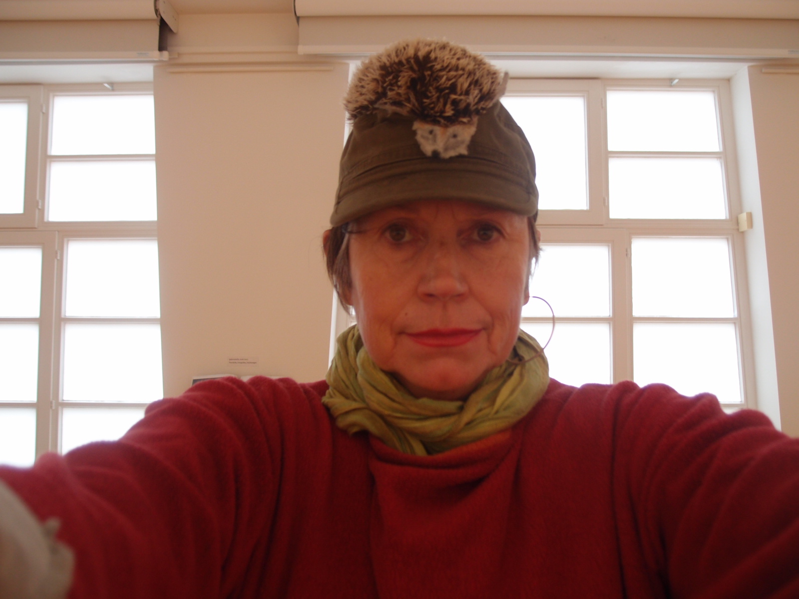 Zurzeit ist einer anderen Künstlerin eine Ausstellung hier im Museum gewidmet: Lilly Fischer´s „Landschaften“ ist bis zum 20.9.2015 zu sehen. Folder Text: Die unkonventionelle Künstlerin Lilly Fischer verwandelt das Paula Moderson-Becker Museum in einen Ort des lebendigen Dialogs zwischen ihren von der Natur inspirierten Arbeiten und den Landschaftsbildern Paula Moderson-Beckers. …Fotografie und Zeichnungen aus Lilly Fischers Worpsweder Zeit stehen neben bizarren, überlebensgroßen Faltern Spinnen- und Schnacken Objekten. Zur Zeit sind es die Igel die im Mitelpunkt ihrer Forschung stehen. Im obersten Stock darf ich dann wieder fotoprafieren und mich zur Teppin machen. Hat aber Spaß gemacht. Ich habe einen Igel am Kopf und an an speziellen Tagen wird der Igeltanz hier zelebriert.