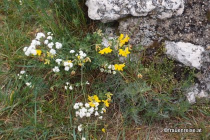 Mache mich auf, auf den Berg zu gehen. Nehme den steilen Weg. Tut gut, dieses sich hinausheben aus dem Dorf. Von untern erklingt Blasmusik. Rosa, meine Nachbarin, ist zu einer Diamantenen Hochzeit eingeladen. Grauer Himmel. Der Flieder ist verblüht, aber gelber Klee, winziger, lila blühender Thymian, dunkelvioletter Wiesensalbei und Hirtentäschel, mit den kleinen Herzblättern geben Zeichen von Wachsen und lebendig Sein.