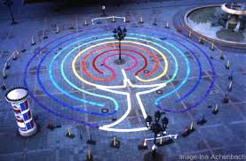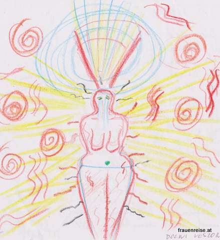 Meine Freundin Silvia hatte beim Fest der 2000 Frauen mit dem Frauen Gedenk Labyrinth, im Jahr 2000, in der Frankfurther Oper die Göttin Ostara vertreten. Sie war golden und rot gekleidet und Ostara steht auch für die Morgenröte, also für den Anfang, den Neubeginn. Ich hatte die Ehre Dr. Felicitas Goodman zu vertreten. Manche hielten mich für Frida Kahlo. Na auch nicht schlecht.