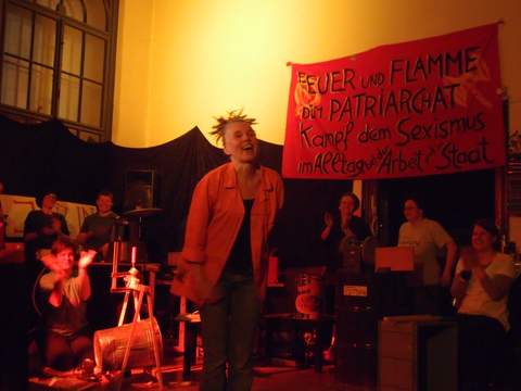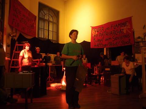 Danach fahre ich wieder ins FZ zum JazzIn mit dem Maschinen Orchester. Heute ist es ziemlich voll. Das Orchester alleine besteht ja schon aus 12 Frauen. Es wird unter der Leitung von Eva Königer ein im Moment entstehendes Klangwerk gezeigt, dessen Sound mit Handwerksmaschinen, Werkzeuge und diverse Baumaterialien entsteht. Also laut, schrill und rhythmisch. Das Publikum und die Musikerinnen haben großen Spaß dabei.