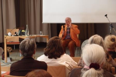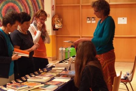 Foto 1: Vortrag Trance und Klang, Foto 2: Batiktuch, Foto 3: der Büchertisch vor dem Verkauf,