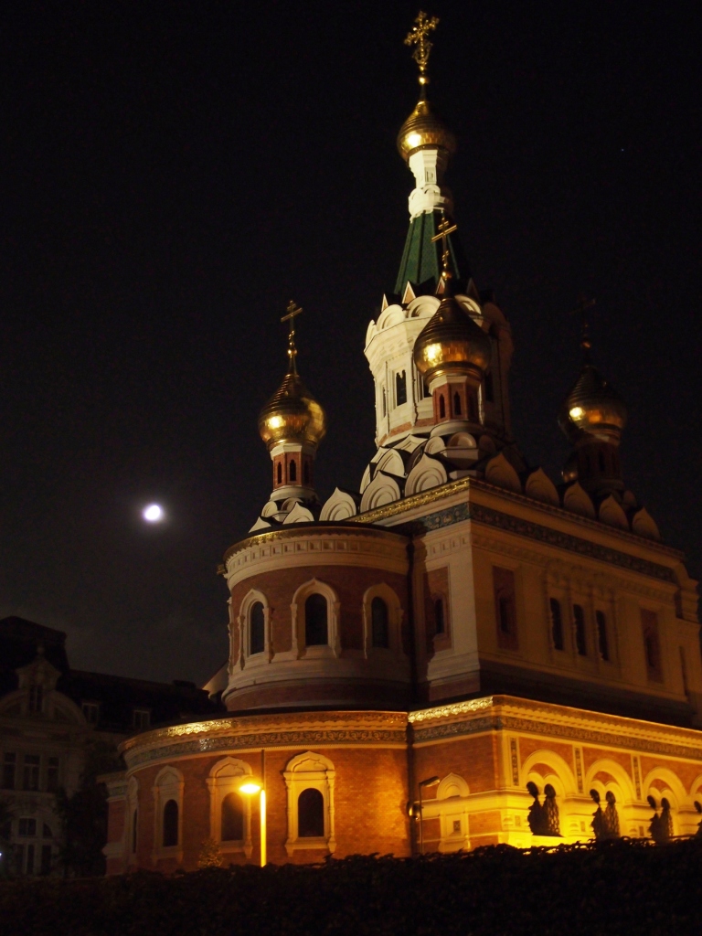 Beim nach Hausegehen-schweben komme ich an der russischen Kirche vorbei. Ich sehe ein Bild, dass ich fotographieren muss. Die Mondin spiegelt sich scheinbar in den goldene Kuppeln der russisch orthodoxen Kirche. Ich hole die Kamera und drücke ab.