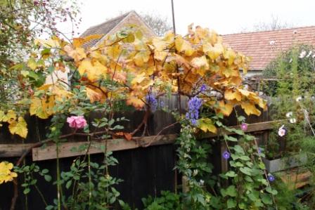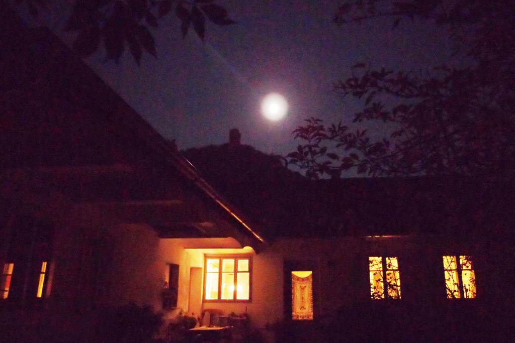 Es berührt mich. Ebenso die roten Weinblätter, die ich am Morgen im Sonnenlicht leuchten sehe und die Mittags, unablässig zu Boden schweben. Die Sonne ist eine rote leuchtende Kugel 5 Minuten vor dem Horizont und später sehe ich die Mondin hinterm Berg aufsteigen. Der dunkelnde Himmel in der Dämmerung vom Fenster aus im Stall.