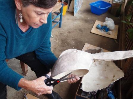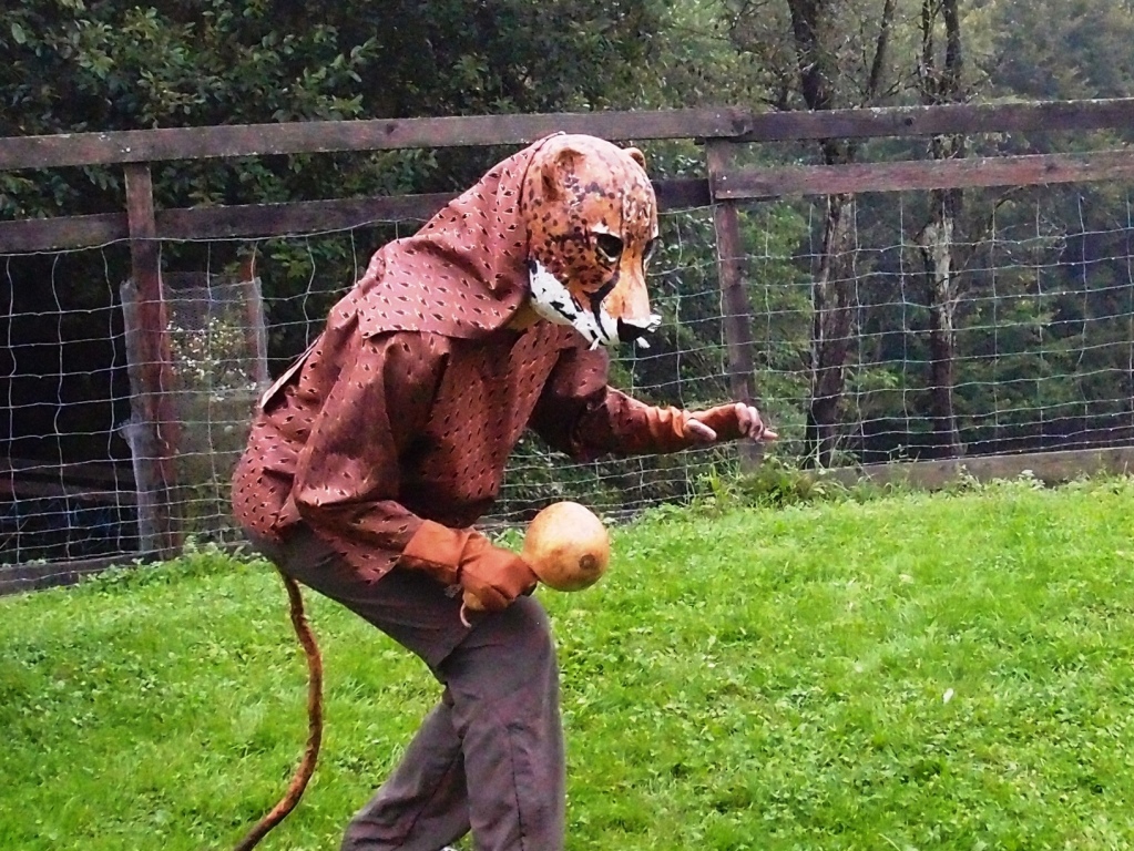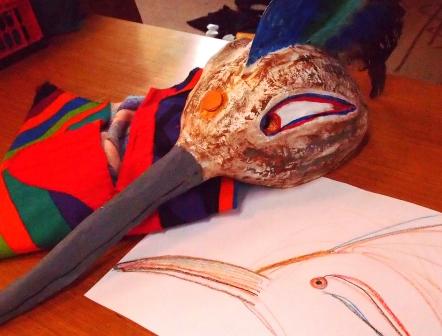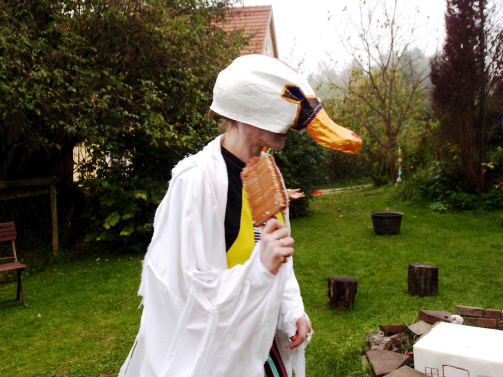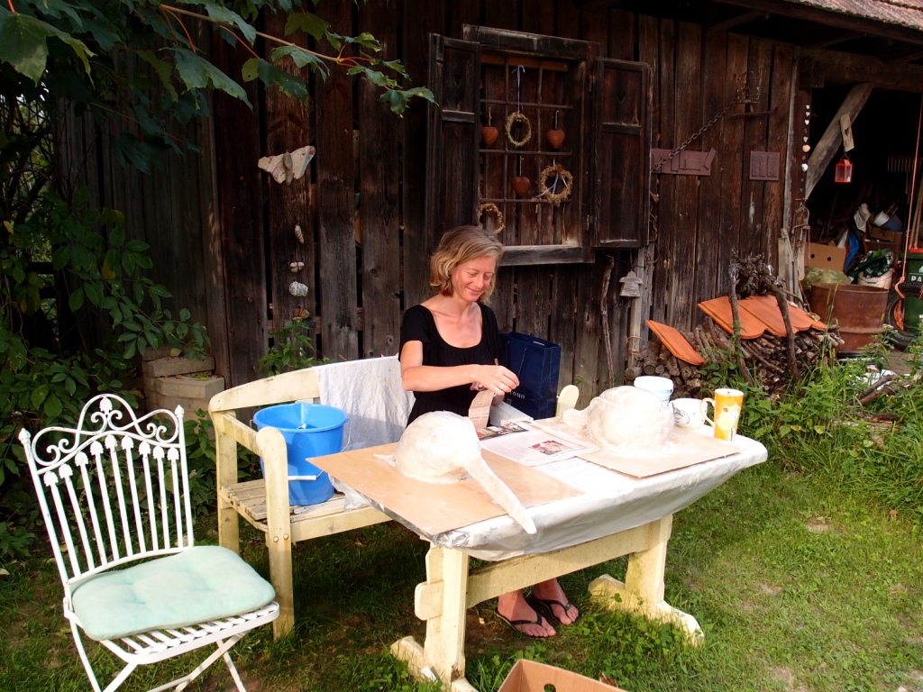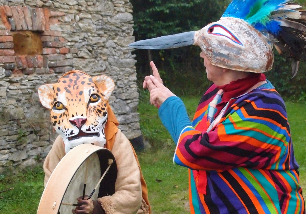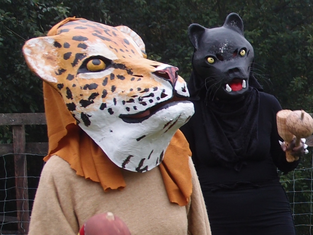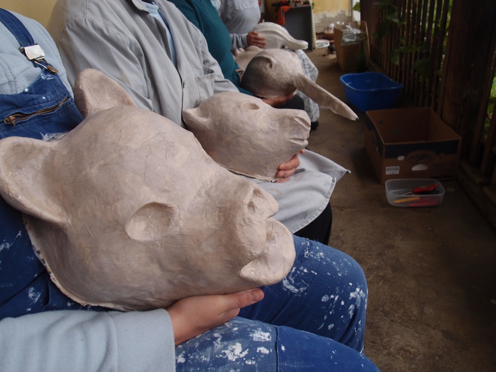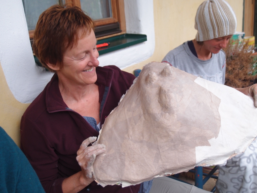 Felicitas Goodman beschreibt es als ein sehr wichtiges Ritual, das uns Menschen etwas zurückgeben kann, was wir verloren glauben. Aus diesem Mangel suchen wir Ersatzglücke. Erst durch die Ekstase und in der Verbindung mit dem  Kraftwesen können wir die Freude des Feierns in einer Urform erleben. Als erste Trance dieser Vorbereitungsphase haben wir die liegende Haltung Der „Reise in die Unterwelt eingenommen“. Es ist immer spannend, welche Tiergeister sich in der unteren Welt der Hilfgeister zeigen werden und ob überhaupt. Doch jede Frau hat ganz klar eine Begegnung. Wir formen aus Ton Modells der Tiermasken. Wunderschöne Gesichter treten hervor. Danach das Formen und Bilden von Papierschicht um Papierschicht, bis ein festes und leichtes Gebilde entstanden ist.