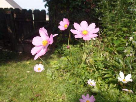 Ich gehe mit der Kamera durch den Garten. Was sehe ich? Farben und Blüten. Schön finde ich die Cosmeen vor dem dunklen Hintergrund des alten Holzzaunes und die roten, prallen Hagebutten, die duftenden, fast schwarzen Isabellatrauben, die letzte New Dawn Rose in Hellrosagrau und eine andere englische Rose, zitternd am Stamm.