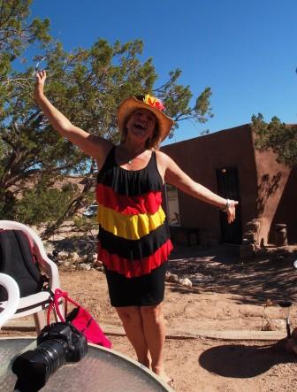 Am Nachmittag sind Susanne und ich mit dem Bus auf den Museumshügel gefahren, durch die Canyon Road, vorbei an den vielen kleinen, interessanten Gallerien. Oben am Hügel ist das „Museum for Indian Art and Culture“ mit einer permanenten Ausstellung über die Indigenen in New Mexico.Zurückkommend erstehe ich auf der Plaza eine kleine –Rassel aus dem Pueblo Santa Domingo. Das freut mich, da es eine besondere Beziehung zu Santa Domingo gibt. Felicitas hatte nach dem Besuch eines Festtanzes in Santa Domingo einen sehr lebendigen Traum. Der Führer des Pueblos hatte ihr im Traum zu verstehen gegeben, dass sie in New Mexico bleiben und sich ansiedeln soll. Darauf hin hat Felicitas das Land in Cuyamungue erworben.